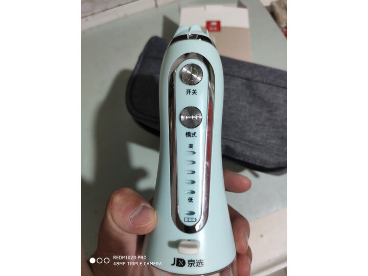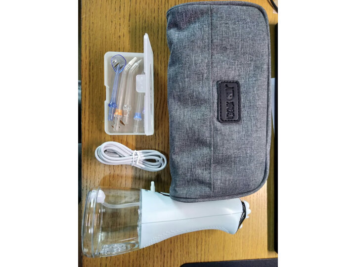 京选此款便携电动冲牙器,1500次/分钟高频脉冲清洗,有效帮助清洁各种口腔问题,改善牙龈健康,五档模式可调,搭配五种喷头,更立体清洁口腔,机身防水可冲洗,轻便易携,随时随地,洁净随身。重力球设计,多角度持续出水,带2分钟智能提醒。水箱容量238毫升,防水等级IPX7,池容量2500mAh,页面宣传充电5小时,续航15天,功率21W。性价比高,特价时候买的,配的五款喷头也很实用,非常棒。送的手拿包,手感,做工非常好。棒棒的。